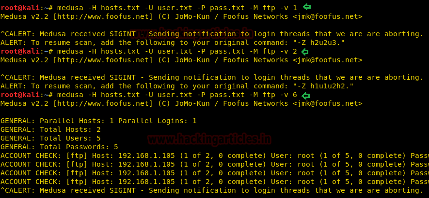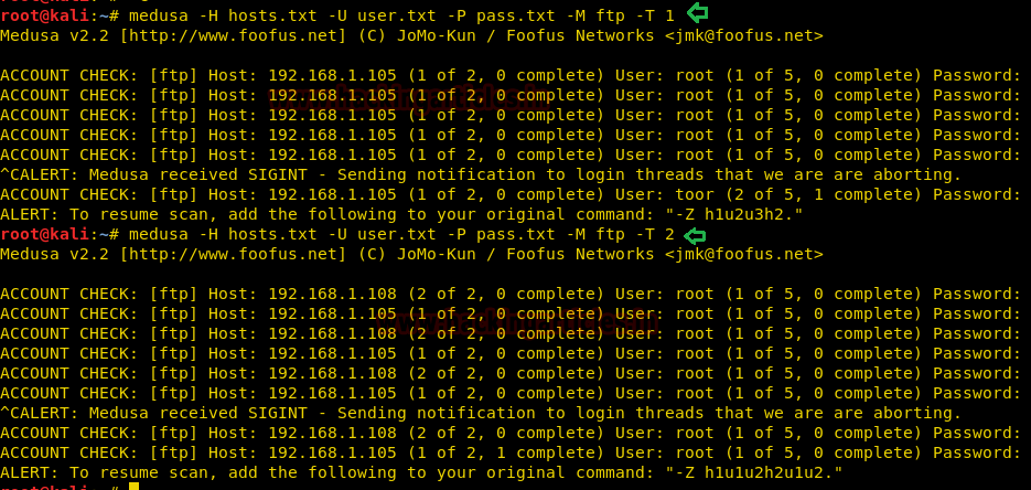| 12 | medusa -H hosts.txt -U user.txt -P pass.txt -M ftp -T 1medusa -H hosts.txt -U user.txt -P pass.txt -M ftp -T 2 |