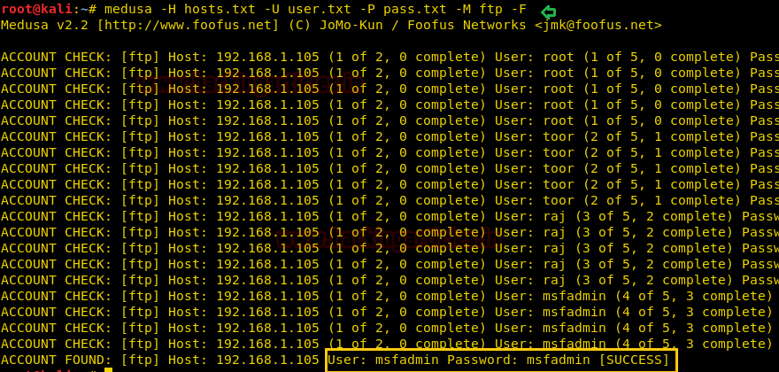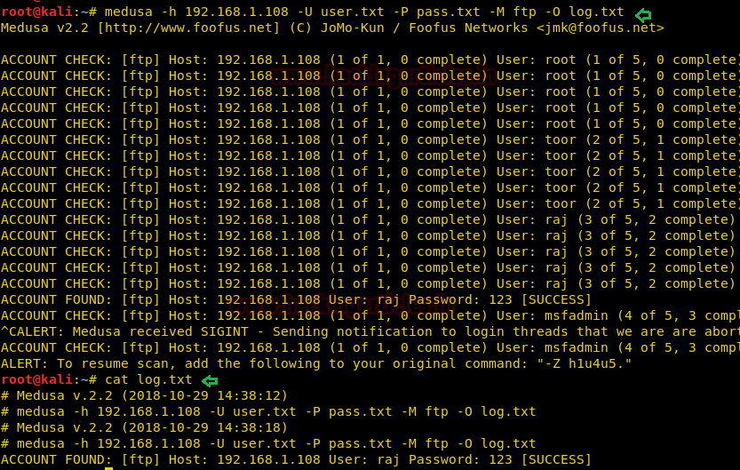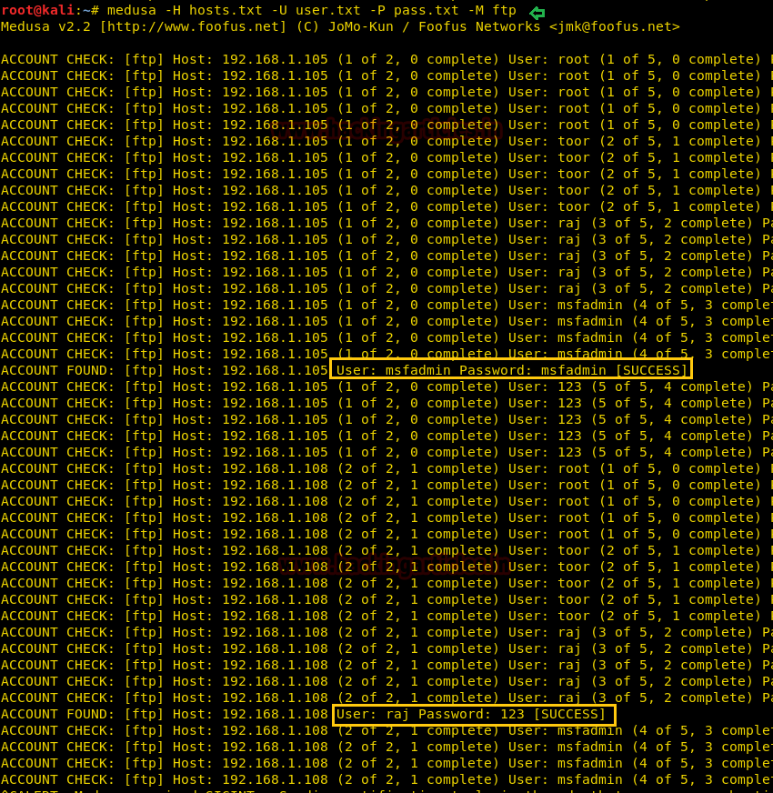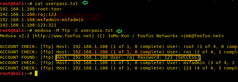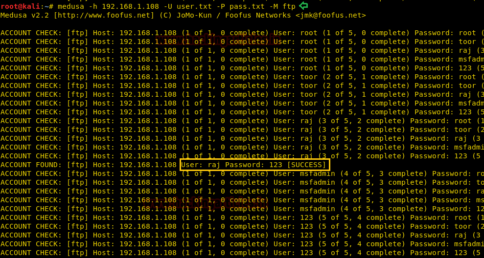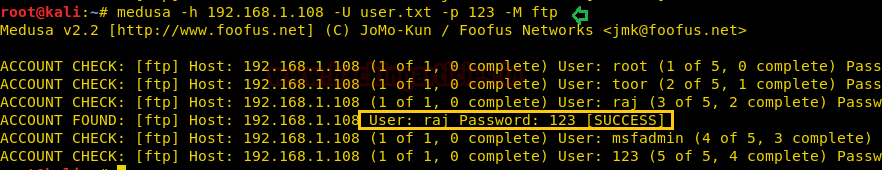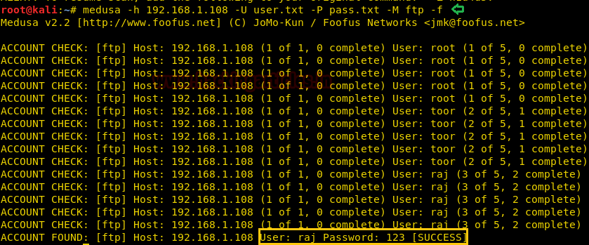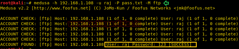 | 1 | medusa -h 192.168.1.108 -u raj -P pass.txt -M ftp |