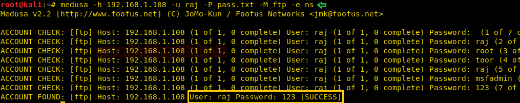 | 1 | medusa -h 192.168.1.108 -u raj -P pass.txt -M ftp -e ns |