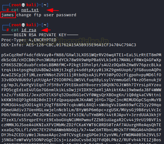 We read the note to find that a user by the name of james has changed the ftp password. It is possible that james is a user that has SSH access and id_rsa key would help us to login as james user via SSH.