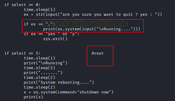 Upon close inspection, we observe 2 things. First that it prints a list in front of the user. The number 5 entry on the list says “#Root Shell Spawn” But if we take a closer look, we can see that it is a rabbit hole placed very nicely. If the user selects number 5 it shutdowns the machine and terminating the access of the user. Option 0 asks the user if they want to quit? It asks the user for confirmation. If the answer is a dot (.), the program will display a “Running…..” message. But it is not running anything but actually waiting for input. That will execute system commands.