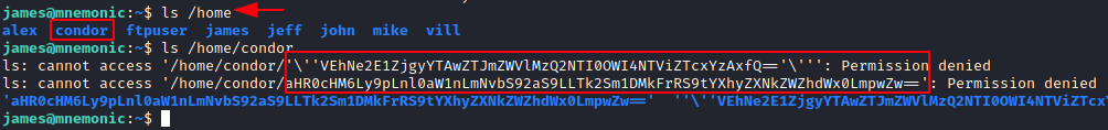We start some manual enumeration of users which gave us condor. We remember condor user from that note. We tried to list the files inside the condor user’s home directory to see that the access is denied but still we have the name of directories which seem to be base64 encoded.