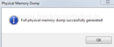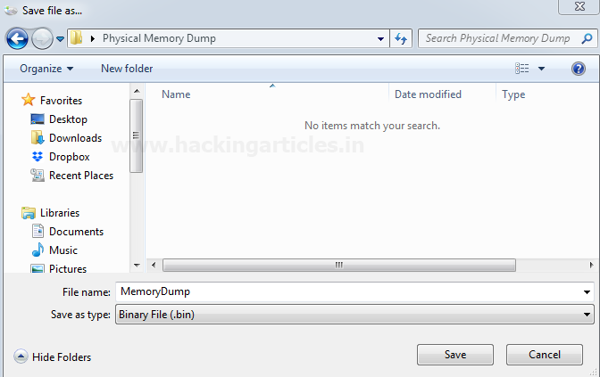 Nhấp vào kết xuất Bộ nhớ vật lý, thao tác này sẽ kết xuất bộ nhớ vật lý / RAM trong tệp .bin và có thể lưu nó ở bất kỳ đâu. Trong hình ảnh dưới đây, chúng tôi đang lưu tệp với tên Memory Dump.bin trong một thư mục có tên là Physical Memory Dump trên Desktop