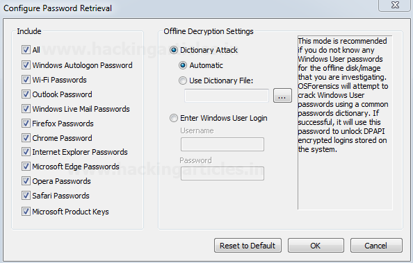 Nhấp vào nút Cấu hình, kiểm tra các mật khẩu bạn muốn khôi phục. Chọn cài đặt giải mã dựa trên yêu cầu, chúng tôi có thể đưa vào tệp từ điển của mình hoặc có thể sử dụng từ điển tự động. Nếu thông tin xác thực được biết, các bạn có thể cung cấp thông tin xác thực đăng nhập windows và bấm OK.