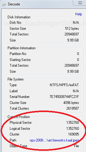 Nhấp vào nút giải mã (Decode) để nhận thông tin chi tiết của tệp. Điều này sẽ cung cấp số cụm và khu vực của tệp.