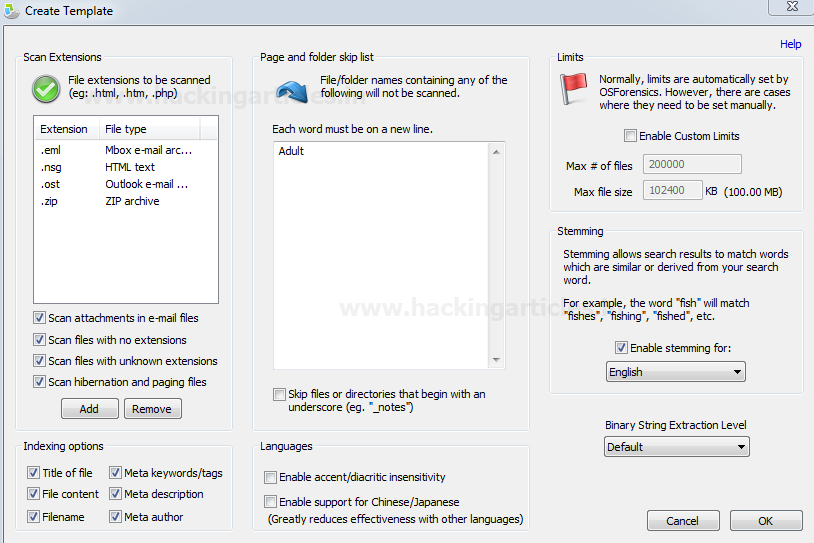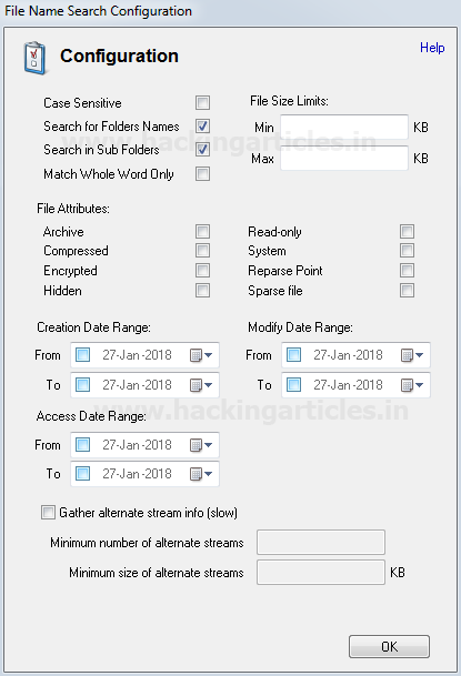 Chúng ta có thể chọn các phần mở rộng cần tìm kiếm, bỏ qua bất kỳ tệp hoặc thư mục nào bằng cách chỉ định tên của chúng hoặc bằng cách giới hạn kích thước tệp. Tùy chỉnh mẫu và bấm OK