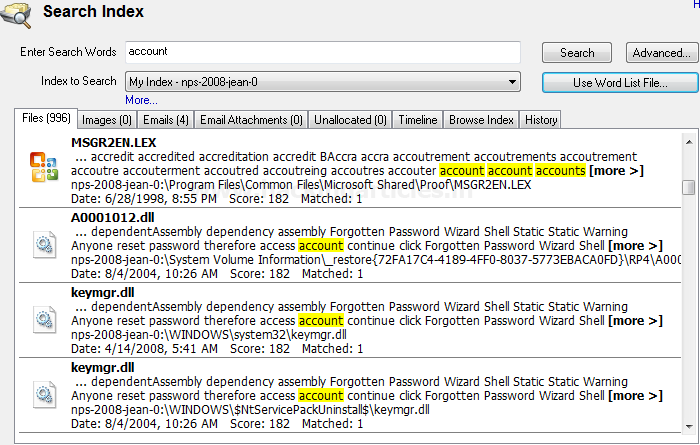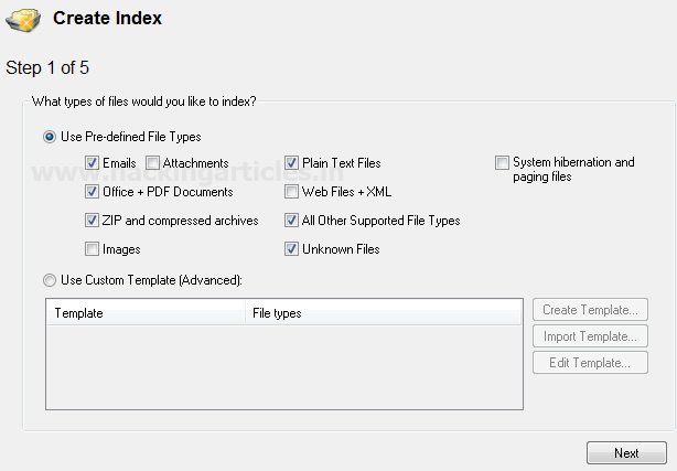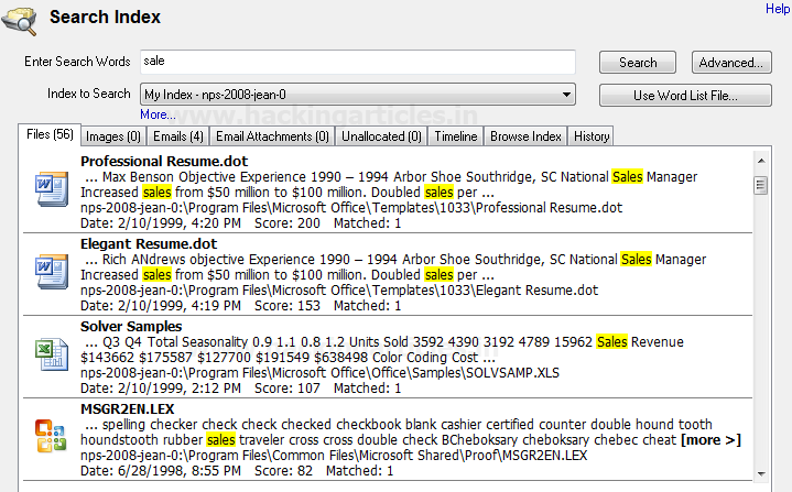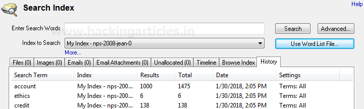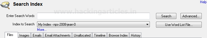 Phương pháp trực quan nhất để tìm kiếm từ khóa là cung cấp một từ khóa duy nhất và tìm kiếm sự xuất hiện của từ khóa đó trong dữ liệu / bằng chứng của chúng ta. Để đạt được mục tiêu này, cách tốt nhất là tạo một chỉ mục của ổ đĩa / thư mục mà chúng ta cần thực hiện tìm kiếm trong đó. Chỉ mục chỉ đơn giản là một danh sách các hiệu số cho sự xuất hiện của các từ khóa bắt buộc. Lập chỉ mục cho phép tìm kiếm trong nội dung của nhiều tệp / ổ đĩa / thư mục / tệp hình ảnh cùng một lúc.