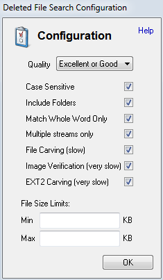 Nhấp vào nút “Cấu hình” và chọn / bỏ chọn các tùy chọn theo yêu cầu. Chọn Chất lượng từ menu thả xuống (Xin lưu ý rằng chất lượng tốt hơn sẽ mất nhiều thời gian hơn để xử lý), để có kết quả tốt hơn, hãy kiểm tra tùy chọn khắc tệp. Các bạn cũng có thể giới hạn kích thước tệp muốn tìm kiếm (điều này sẽ bỏ qua các tệp không nằm trong phạm vi để tinh chỉnh tìm kiếm), Nhấn Ok.