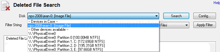 Để tìm kiếm các tệp đã xóa, hãy nhấp vào “Tìm kiếm tệp đã xóa” và chọn ổ đĩa mà chúng ta muốn tìm kiếm từ menu thả xuống. Chúng ta có thể chọn toàn bộ Ổ đĩa vật lý / Đĩa cứng (PhysicalDrive0), Bằng chứng thu được hoặc bất kỳ ổ đĩa Lôgic nào (C / D / E) mà các bạn muốn khôi phục dữ liệu.