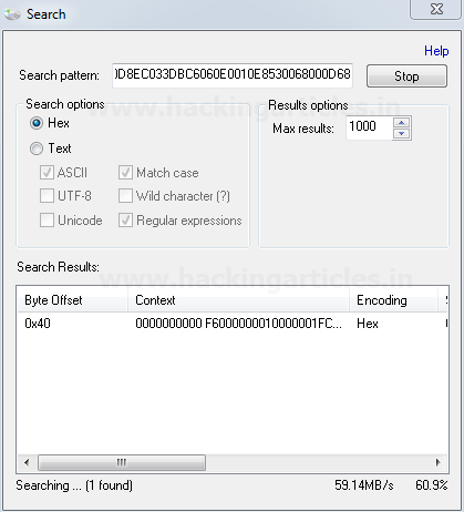 Bấm vào nút Tìm kiếm, một màn hình sẽ xuất hiện để chúng ta có thể tìm kiếm Hex hoặc Text và tiếp tục. Thao tác này sẽ tìm kiếm văn bản hoặc Hex cụ thể trong các sector thô và sẽ hiển thị kết quả.