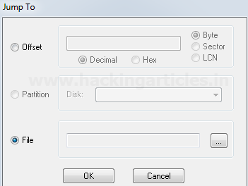 Để tìm kiếm một tệp / khu vực / offset cụ thể, hãy nhấp vào nút Jump To, chúng ta có thể thấy một màn hình để chọn bất kỳ tệp hoặc offset cụ thể nào.
