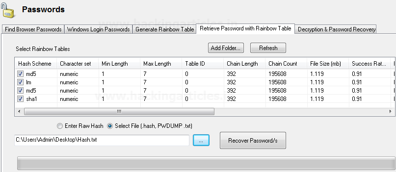Mật khẩu thông qua một bảng cầu vồng rainbow table. Nếu mật khẩu nằm trong bảng cầu vồng mà chúng ta đã tạo và có NT hash và LM Hash, ta có thể khôi phục mật khẩu . Để đạt được điều này, các bạn cần thêm thư mục của bảng Rainbow trong “Chọn bảng Rainbow / Select Rainbow Table” và có thể nhập hàm băm thô hoặc có thể duyệt tệp có thể chứa hàm băm, nếu mật khẩu có trong bảng cầu vồng, ta sẽ nhận được Mật khẩu.