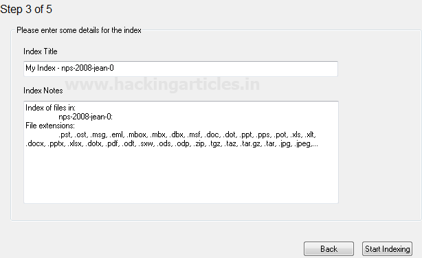 Bây giờ chúng ta sẽ có một cái nhìn về các ổ đĩa mà chúng ta đang lập chỉ mục cùng với các phần mở rộng sẽ được lập chỉ mục. Nếu mọi thứ đều đáp ứng yêu cầu của bạn, hãy nhấp vào “Bắt đầu lập chỉ mục” nếu không, hãy nhấp vào nút “Quay lại” để thực hiện thay đổi .