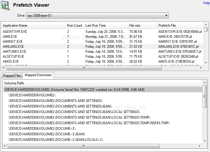 Chúng ta có thể duyệt ổ đĩa từ menu thả xuống để kiểm tra tệp .exe đã thực thi trên một ổ đĩa cụ thể. Các bạn có thể nhấp vào bất kỳ ổ đĩa cụ thể nào và có thể xem chi tiết của exe cùng với các tệp được ánh xạ trong tab tệp được ánh xạ.