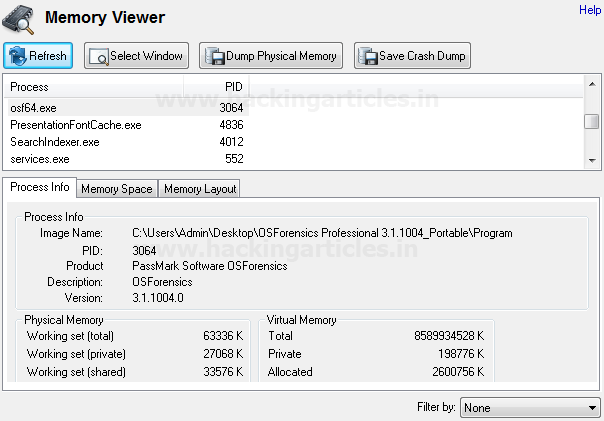 Tính năng Memory Viewer hiển thị bộ nhớ đang hoạt động của hệ thống mà OSF đang hoạt động. Nó không thể được sử dụng để hiển thị bộ nhớ của hình ảnh hoặc ổ đĩa có được của máy tính khác (chúng ta sẽ minh họa tính năng này trên máy đang chạy của mình chứ không phải trên tệp bằng chứng M57-jean). Các bạn có thể kết xuất bộ nhớ trực tiếp / RAM để điều tra thêm với VOLATILITY FRAMEWORK