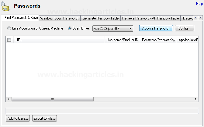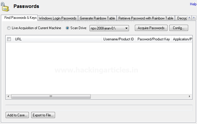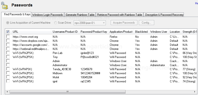Tab đầu tiên là Tìm Mật khẩu & Chìa khóa, điều này sẽ cho phép khôi phục mật khẩu đã lưu trữ từ trình duyệt, outlook, mật khẩu đăng nhập tự động cửa sổ, v.v. Chúng ta có thể thực hiện việc thu thập trực tiếp máy hiện tại hoặc Scan Drive và chọn bất kỳ ổ đĩa hoặc bằng chứng nào.