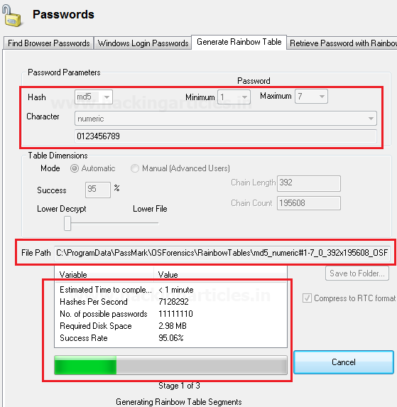 Có một tùy chọn để tạo một bảng cầu vồng. Điều này được sử dụng để tạo một danh sách các mật khẩu với các kết hợp và hoán vị khác nhau. Các bạn có thể chọn từ các tùy chọn / kết hợp khác nhau từ trình đơn thả xuống. Các đầu vào càng lớn và phức tạp thì thời gian sẽ càng lâu.