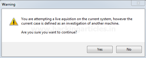 Để nắm bắt quá trình thu nhận trực tiếp của máy hiện tại, hãy chọn tùy chọn đầu tiên và nhấp vào quét. Nếu chúng ta đã chọn điều tra trường hợp của máy khác tại thời điểm tạo trường hợp (được hiển thị trong phần 1 của bài viết này), các bạn có thể nhận được thông báo cảnh báo như hình dưới đây, nhấp vào có để tiếp tục.