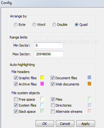 Nhấp vào nút cấu hình và thực hiện các thay đổi cần thiết. Các bạn có thể chỉ định giới hạn phạm vi khu vực, đánh dấu các loại tệp bằng các màu khác nhau, bao gồm / loại trừ các đối tượng hệ thống tệp.
