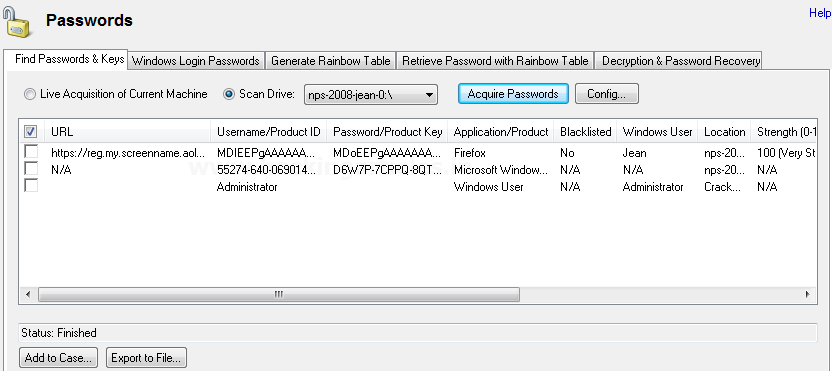 Tính năng mật khẩu cho phép các bạn truy xuất thông tin liên quan đến mật khẩu của bằng chứng. Những mật khẩu này có thể là mật khẩu được lưu trữ trong trình duyệt, Mật khẩu đăng nhập Windows, các bạn cũng có thể tạo bảng cầu vồng bằng cách kết hợp nhiều mật khẩu và truy xuất mật khẩu từ bảng cầu vồng. Trong mật khẩu OSF cũng có một tùy chọn để giải mã một tệp được mã hóa.