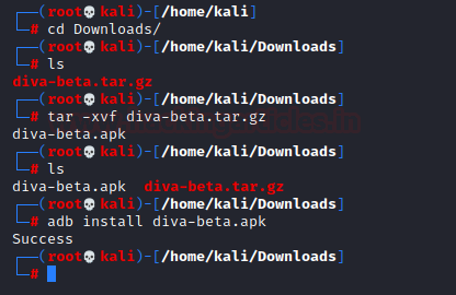 Giả sử chúng ta có một APK được lưu trong thư mục tải xuống của hệ thống mà chúng tôi muốn cài đặt trên một trong các thiết bị. Tại đây, tôi đã tải xuống DIVA từ liên kết này . Chúng ta có thể làm điều đó trong adb bằng lệnh sau: