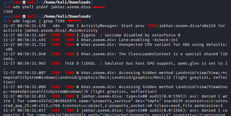 | 1 | adb shell pidof jakhar.aseem.diva |