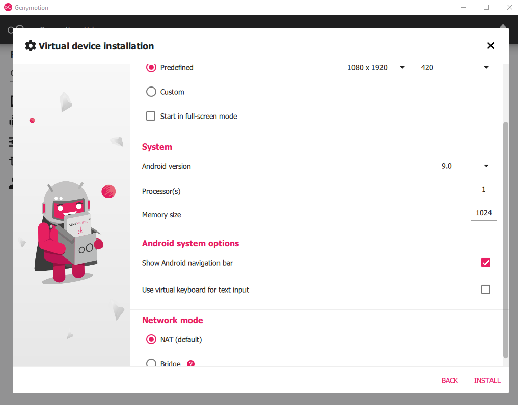 Tôi đã chọn kiến trúc x86 và phiên bản Android 9.0 như trong hình