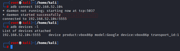 Bây giờ chúng ta đã hoàn tất việc thiết lập môi trường của mình. Trong các ảnh chụp màn hình trước đây, bạn hẳn đã nhận thấy địa chỉ IP của máy ảo trên thanh tiêu đề. Trong trường hợp của tôi, nó là 192.168.52.104 . Đã đến lúc thử và kết nối với máy ảo này bằng Android Debug Bridge (công cụ adb).