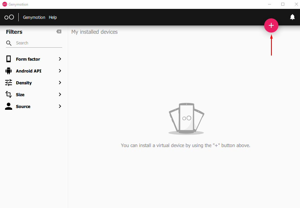 Sau khi đăng nhập, bạn sẽ thấy một màn hình trống có 5 tùy chọn khác nhau trên thanh bên và một nút dấu cộng lớn (+) được sử dụng để tạo máy ảo Android. Bấm vào dấu cộng này.