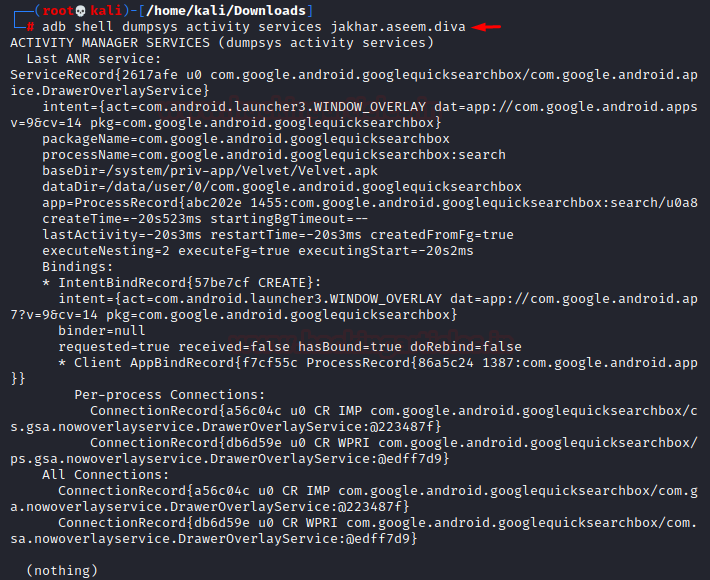 | 1 | adb shell dumpsys activity services jakhar.aseem.diva |