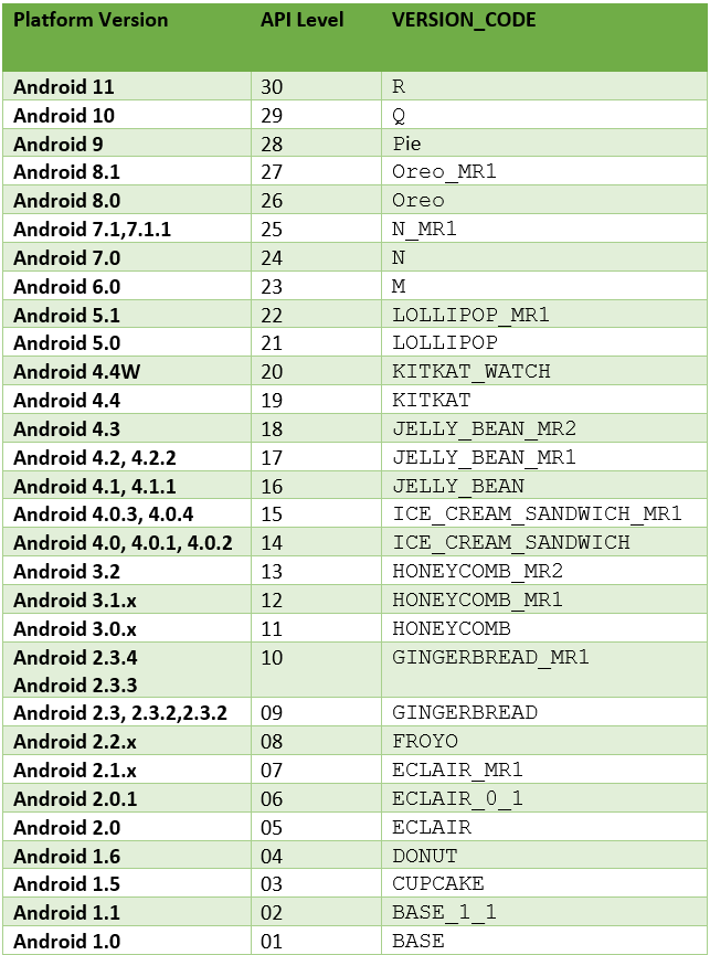 API Android là gì? Android API đề cập đến tập hợp các mô-đun phần mềm khác nhau có các phiên bản khác nhau tạo nên Android SDK. Nói cách đơn giản hơn, Một phiên bản API cụ thể sẽ tương ứng với một bản phát hành Android cụ thể như sau: –