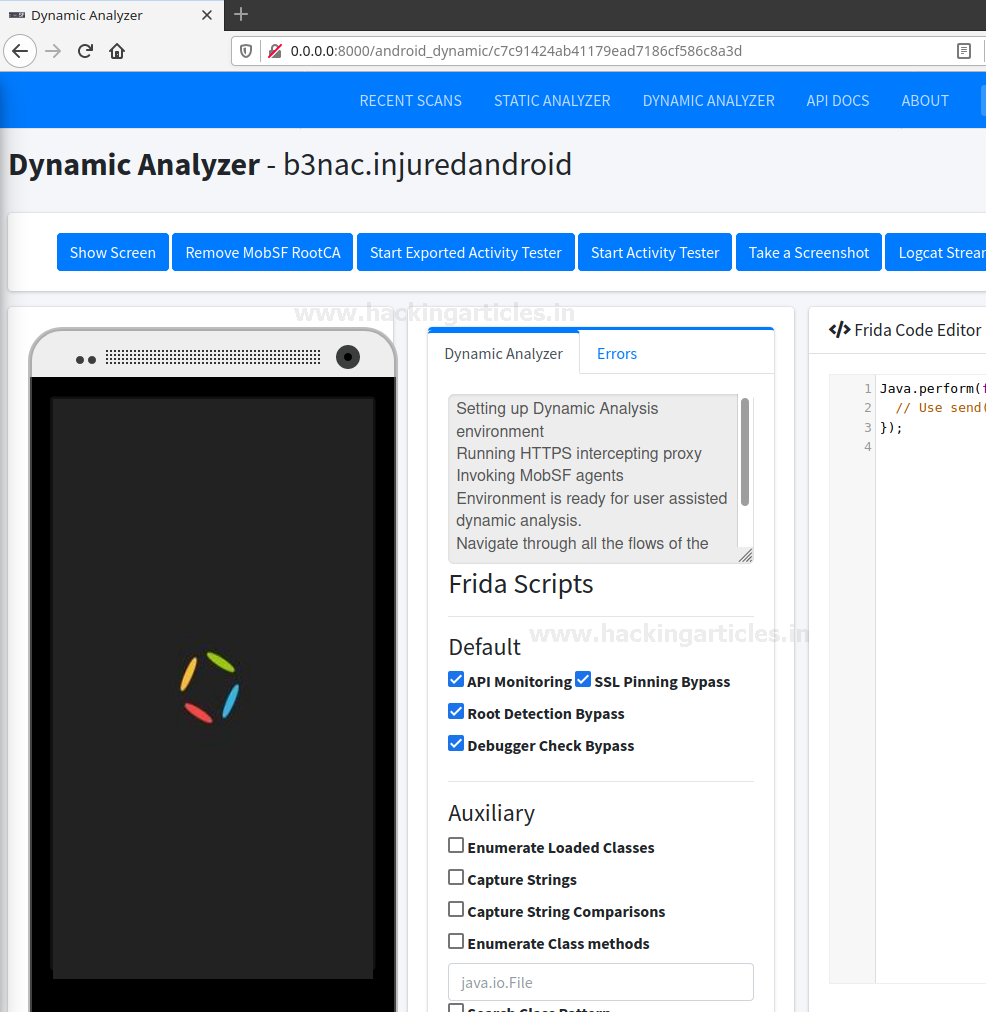 Khi bạn nhấn tùy chọn trình phân tích động hiển thị trên ngăn điều hướng trên cùng, MobSF sẽ tự động gắn vào VM đang chạy nếu MobSF và genymotion đang chạy trên cùng một máy cơ sở. Tuy nhiên, nếu MobSF nằm trong một máy ảo khác, bạn có thể phải đính kèm tác nhân MobSF với IP và cổng từ xa của genymotion. Sau khi nó được gắn vào, chúng ta sẽ thấy màn hình sau đây.
