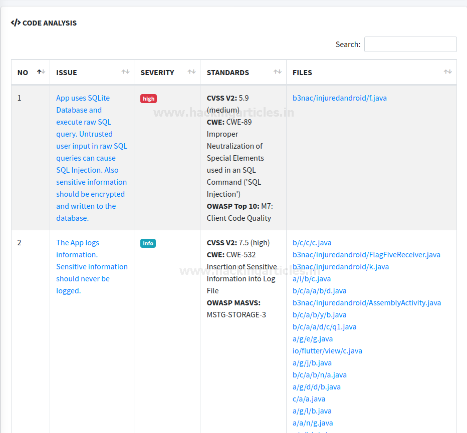 Một trong những tính năng thú vị nhất của công cụ MobSF là phần phân tích mã. Trong phần này, ta có thể thấy rằng MobSF đã phân tích và so sánh một số hành vi của ứng dụng dựa trên các thông lệ tiêu chuẩn bảo mật của ngành như OWASP MSTG và lập bản đồ các lỗ hổng với OWASP Top 10. Thật thú vị khi thấy CWE được đề cập và điểm CVSS được chỉ định ở đây. có thể giúp phân tích các tình huống khác nhau và tạo báo cáo dễ dàng hơn.