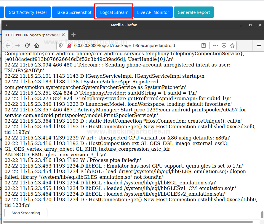 Logcat cũng có thể được xem trong môi trường gốc của MobSF. Có một nút ở menu trên cùng cho phép xem luồng này.