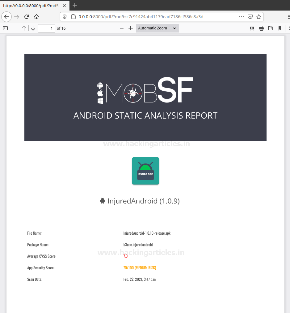 MobSF là một công cụ tuyệt vời để thực hiện phân tích tự động trên các APK Android. Công cụ này không bao gồm phân tích tất cả các lỗ hổng và nhiều thử nghiệm chỉ có thể được tiến hành thủ công nhưng là một công cụ tiện lợi giúp các nhà phân tích ở mức độ lớn.