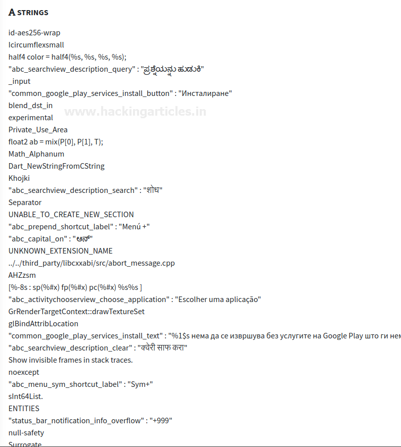 Một phân tích chuỗi toàn diện cũng có sẵn trên MobSF. Những người hiểu biết về phân tích phần mềm độc hại có hiểu biết sâu về chuỗi nhưng đối với những người không biết thì chuỗi chỉ là chuỗi ký tự có thể in được như ASCII và Unicode được nhúng trong một tệp. Việc trích xuất chuỗi có thể cung cấp manh mối về chức năng chương trình và các chỉ báo liên quan đến một nhị phân nghi ngờ. Ví dụ: nếu một APK hiển thị thứ gì đó dưới dạng đầu ra thì luồng đó sẽ được gọi và do đó được hiển thị trong chuỗi. Như hình minh họa ta có thể thấy địa chỉ IP của bên thứ ba mà APK đang giao tiếp. Điều này là cần thiết theo quan điểm phân tích phần mềm độc hại.