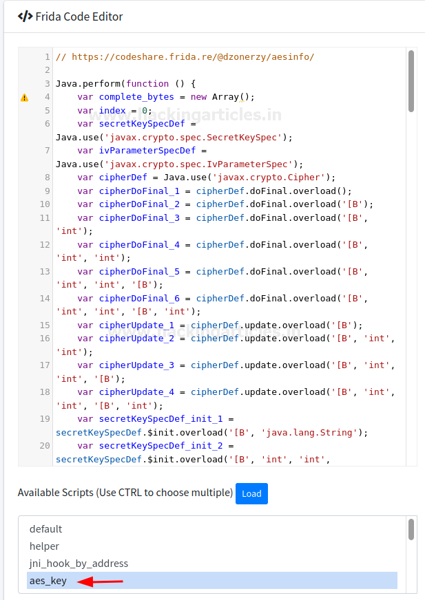 Tương tự, nếu các bạn có thể sử dụng các tập lệnh Frida được định cấu hình trước trong hộp văn bản ở bên phải. Ngoài ra còn có một hộp thả xuống sẽ tải các tập lệnh đó. Bạn cũng có thể chỉnh sửa chúng.