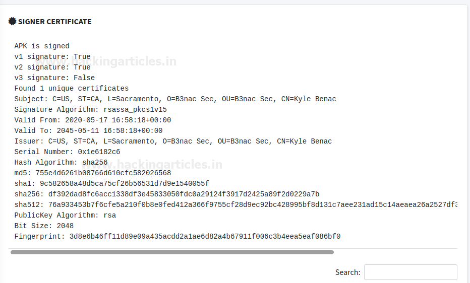 Trong cột chứng chỉ, chúng ta có thể thấy chứng chỉ người ký, nơi người ta có thể tìm thấy thông tin quan trọng về nhà phát triển, quốc gia, tiểu bang, loại bí danh, kích thước bit, v.v.