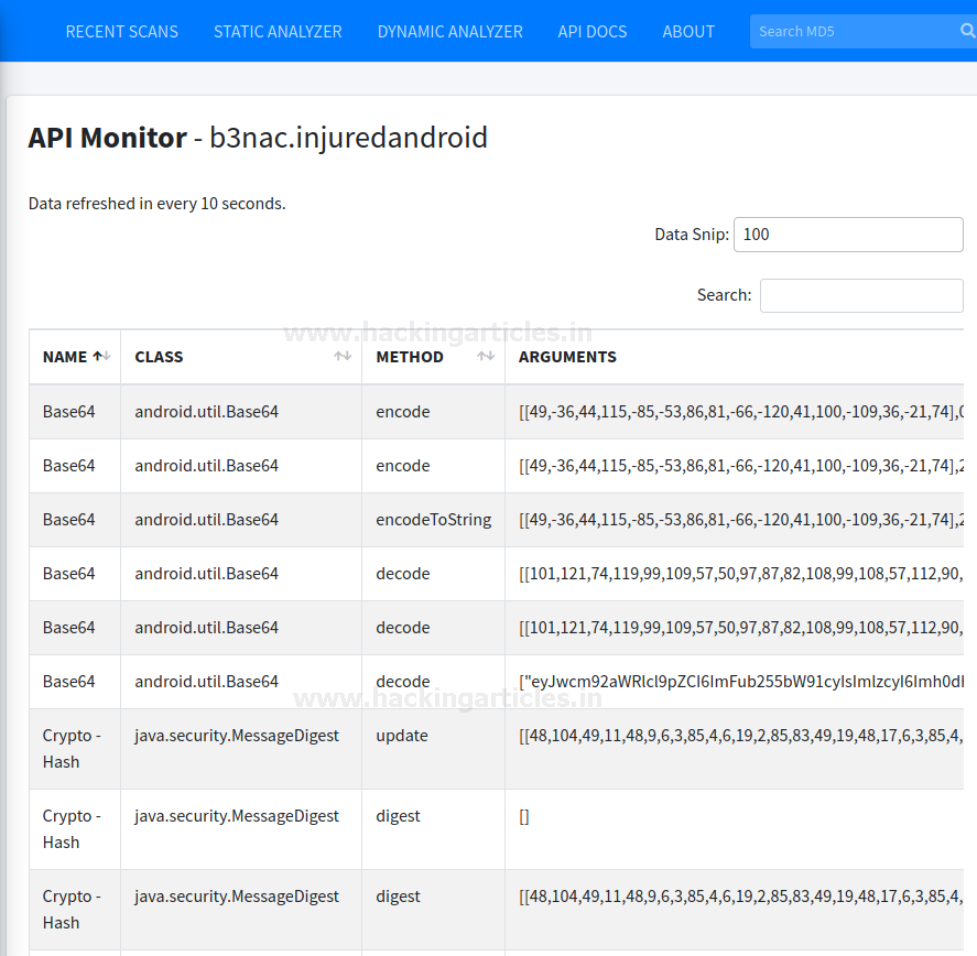 Cũng giống như logcat giám sát nhật ký thiết bị, các API cũng có thể được giám sát. APK sử dụng các API khác nhau trong thời gian thực để thực hiện các chức năng khác nhau, chẳng hạn như thư viện Base64.