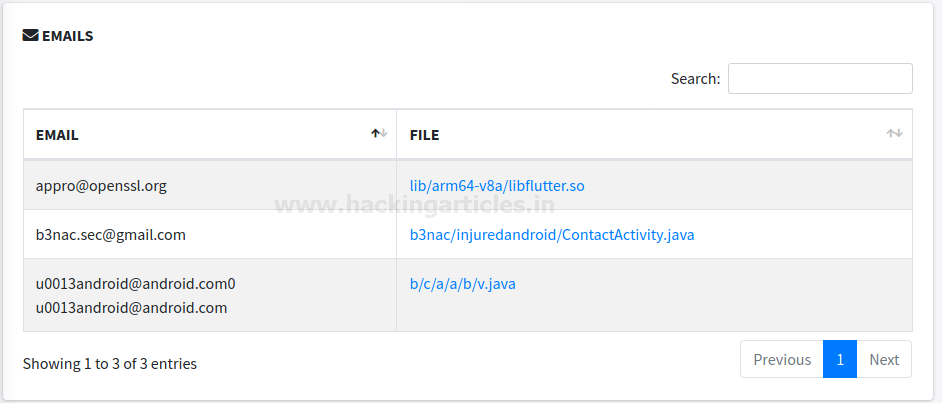 Các bạn cũng có thể tìm thấy các email được mã hóa cứng trong MobSF. Tất cả điều này được thực hiện bằng cách sử dụng mã nguồn được dịch ngược. Thông thường, một pentester có thể tìm thấy các ID email quan trọng đang được sử dụng làm thông tin đăng nhập trên trang web của bên thứ ba để truy cập cơ sở dữ liệu.