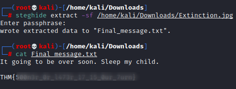 | 1 | steghide extract –sf /root/Downloads/Extinction.jpg |