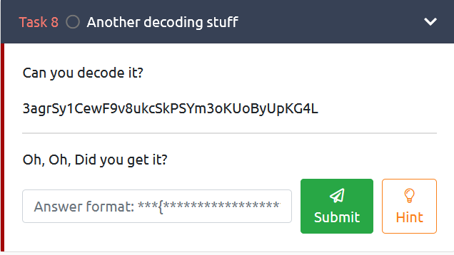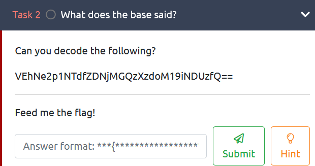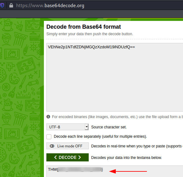 Trong tác vụ này, chúng ta có thể thuận tiện nhận ra rằng giá trị được mã hóa base64. Sau đó, chúng ta sẽ cố gắng giải mã nó bằng bộ giải mã base64.