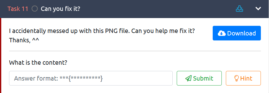 Đây là nhiệm vụ thú vị nhất của toàn bộ phòng thí nghiệm. Vì có một png bị hỏng nhưng vì vậy ở đây chúng tôi đã cố gắng trích xuất mã thập lục phân của hình ảnh đó nhưng sau khi nghiên cứu một thời gian, chúng tôi nhận thấy rằng số ma thuật của nó khác với số ma thuật thông thường.