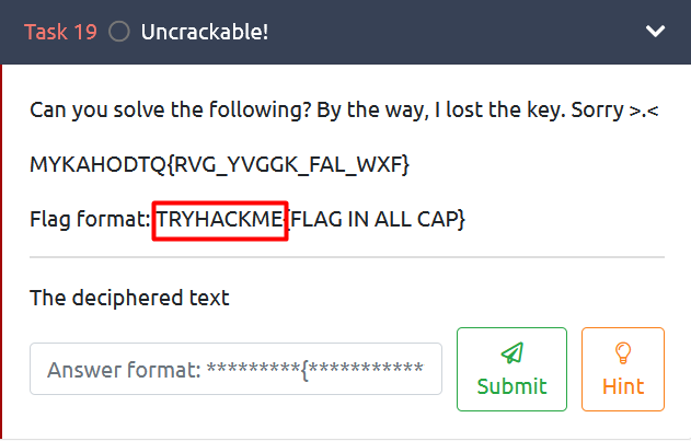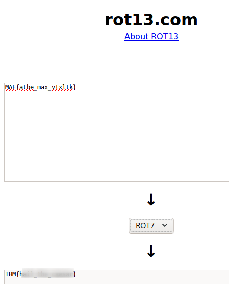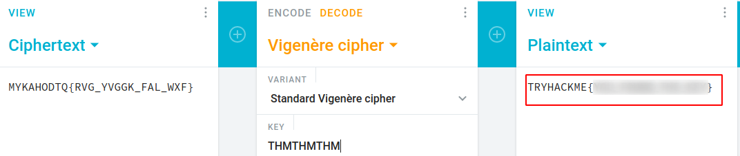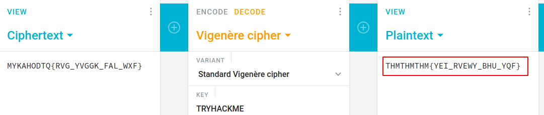 Có vẻ như chúng tôi đã tìm thấy một THMTHMTHM không đổi khác. Bây giờ chúng ta có thể cố gắng giải mã liên tiếp bằng cùng một khóa là TRYHACKME hoặc chúng ta cũng có thể sử dụng THMTHMTHM làm khóa để giải mã MYKAHODTQ {RVG YVGGK FAL WXF}