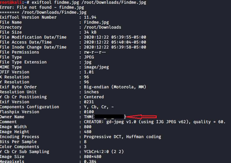 | 1 | exiftool findme.jpg /root/Downloads/Findme.jpg |