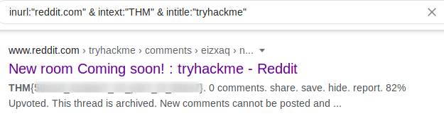 | 1 | inurl:”reddit.com” &intext:”THM” & intitle:”tryhackme” |