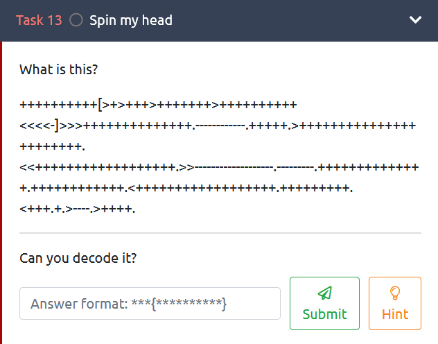 Vì vậy, chúng tôi trực tiếp đi đến bộ giải mã binaryfuck và do đó chúng tôi nhận được lá cờ thứ 13 của mình chỉ bằng cách giải mã nó.