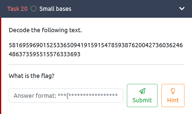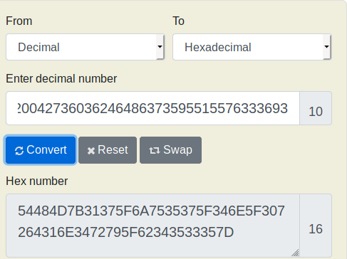 Nhiệm vụ này cũng thuộc về mật mã. Trong nhiệm vụ này, các gợi ý nói (dec-> hex -> ASCII), chúng tôi chỉ cần làm theo các mẹo sau đó là chuyển đổi thập phân thành hex trước