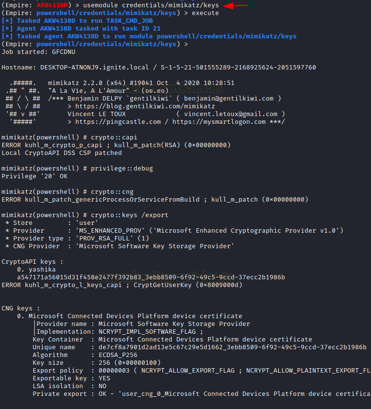 Mô-đun keys của PowerShell Empire hoạt động trên mặt sau của mô-đun tiền điện tử của Mimikatz, Đây là một trong những mô-đun lâu đời nhất vẫn còn hoạt động trong môi trường hoang dã. Nó chỉ đạo các chức năng CryptoAPI của mục tiêu. Theo nghĩa chung, khả năng sử dụng giống như nhị phân certutil có trong Windows Machine theo mặc định. Nó sử dụng việc mạo danh mã thông báo để làm lợi thế của nó và sau đó vá các chức năng CryptoAPI kế thừa để vá dịch vụ cách ly khóa CNG giúp các khóa có thể xuất được. Sau đó, nó chỉ xuất các khóa đó trong một tệp PVK.
