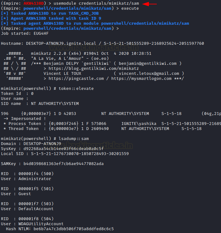 Mimikatz có khả năng lấy lại mật khẩu văn bản rõ ràng cũng như hàm băm. Điều này được thực hiện bằng cách khai thác Dịch vụ Cơ quan Bảo mật Cục bộ trên Windows. Sau khi máy bị xâm nhập, kẻ tấn công có thể sử dụng PowerShell Empire để tải mô-đun mật khẩu đăng nhập nhằm trích xuất mật khẩu văn bản rõ ràng. Những mật khẩu này có thể được sử dụng để tạo Vé vàng, Tiếp quản tài khoản hoặc chỉ là một bước sơ bộ cho một cuộc tấn công khác. Như chúng ta có thể thấy hình ảnh cho thấy rằng chúng tôi đã trích xuất thành công mật khẩu cho Người dùng Yashika và Aarti.